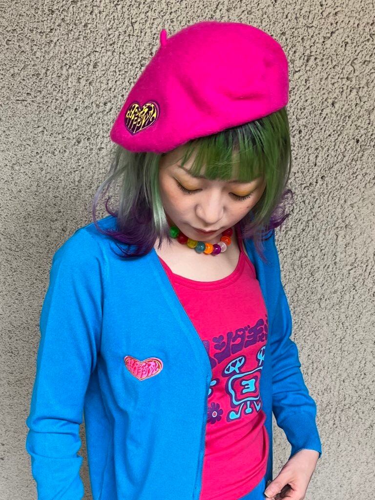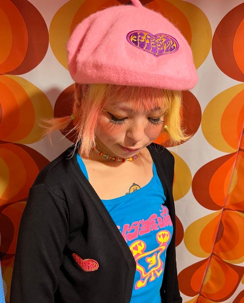 ハートにヨシダチャンネルのサイケ文字がかわいいよね⭐︎刺繍なので光の加減で色味の変化を楽しめるところもいい⭐︎